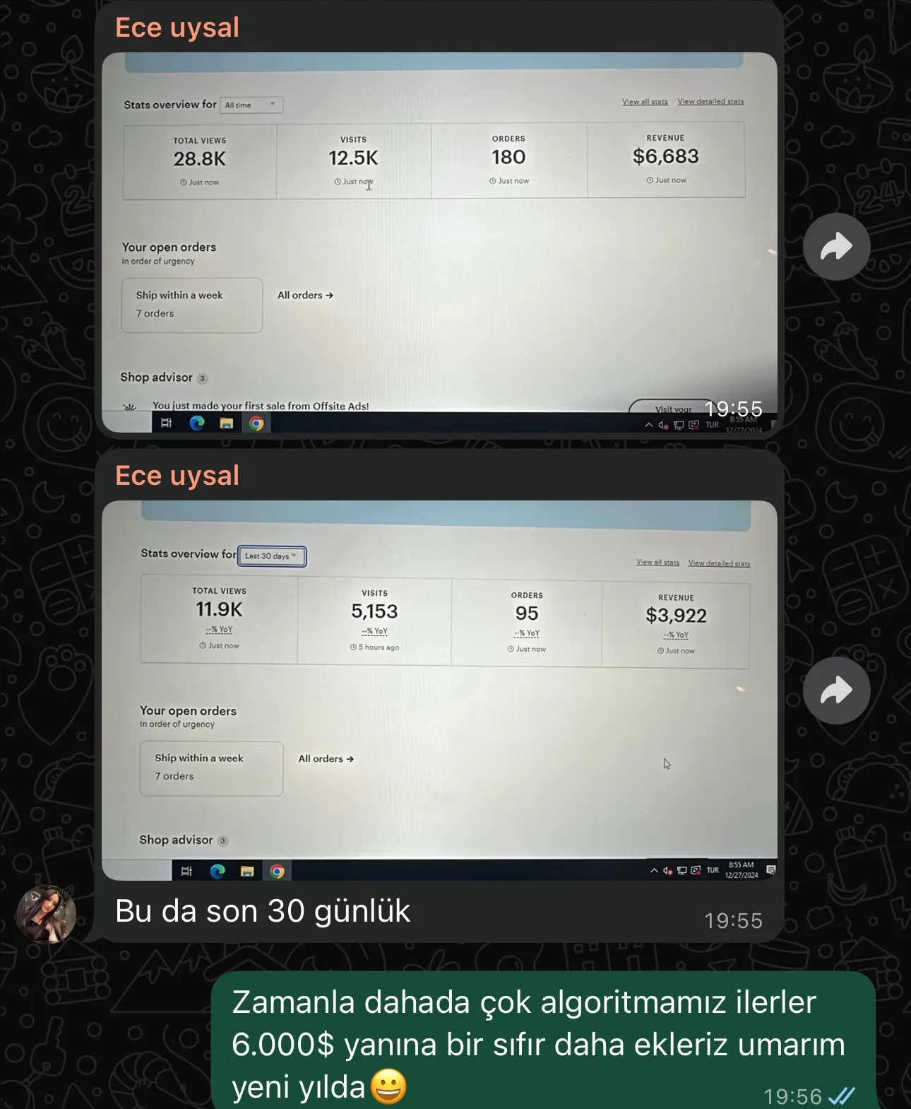 "Kerem ile 4 ayda 17.000 dolarlık bir ciro elde ettik ve yeni açtığımız mağazada tek bir siparişten 2200 dolarlık bir satış yaptık"