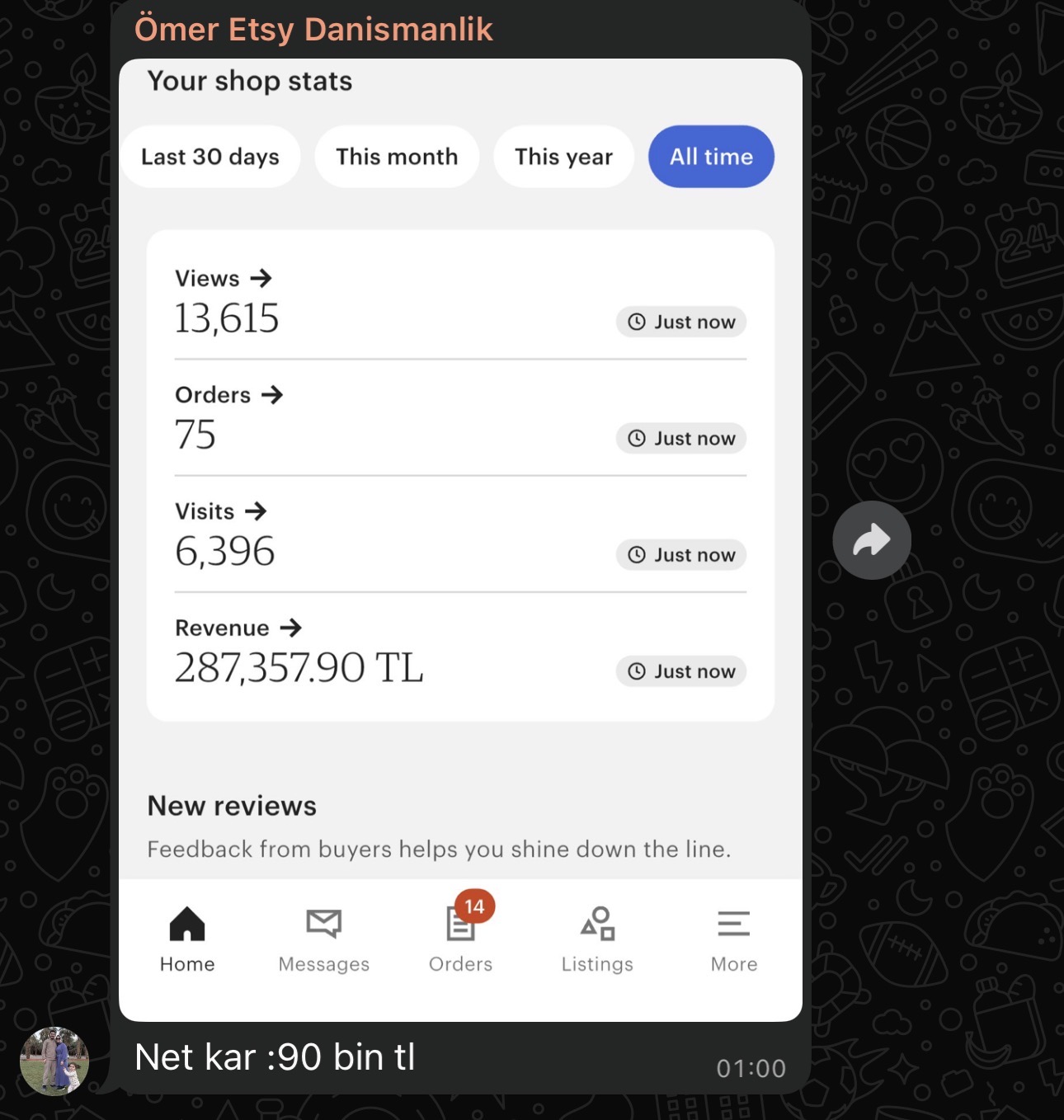 Etsy maceramda Türkiye'den pek çok üreticinin ürünlerini Etsy'de yurtdışına satarak milyon cirolar elde ettik, print on demand dijital ürün satışı gibi Etsy'deki tüm iş modellerini yaptım. Şuanda aktif olarak Etsy'de sadece dropshipping yapıyorum.